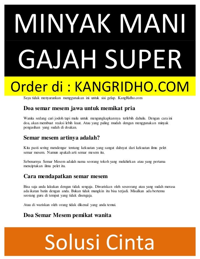 Cara menggunakannya sangalah mudah, karena energi pengasihan pada mani gajah sudah sangatlah kuat, anda tidak perlu melakukan ritual khusus lagi. Namun, kebalikannya jika digunakan untuk memikat hati pria. Atau dioles sedikit ke alis bagi anda para kaum hawa. Sebelum memakai parfume, baca doa pengasihan pemikat pria sebanyak 1 kali saja. Hubungan intim tidak bisa dipungkiri menjadi salah satu faktor harmonis atau tidaknya kehidupan rumah tangga. Untuk minyak mani gajah, anda bisa langsung mengoleskan cairan parfum pada benda tersebut. Beginilah cara menggunakan batu mani gajah. Itulah cara memikat hati pria dengan cepat media minyak wangi. Sep 13, 2016 · baca juga : Meski anda adalah seorang wanita dan ingin mendapatkan pria idaman, tidak jadi masalah. Lebih utama pakaian atau bisa juga dengan fotonya. Apalagi ketika bertemu pria idaman, parfume ini wajib anda pakai. Siapkan barang atau benda yang sering dipakai atau setidaknya pernah dipakai oleh.